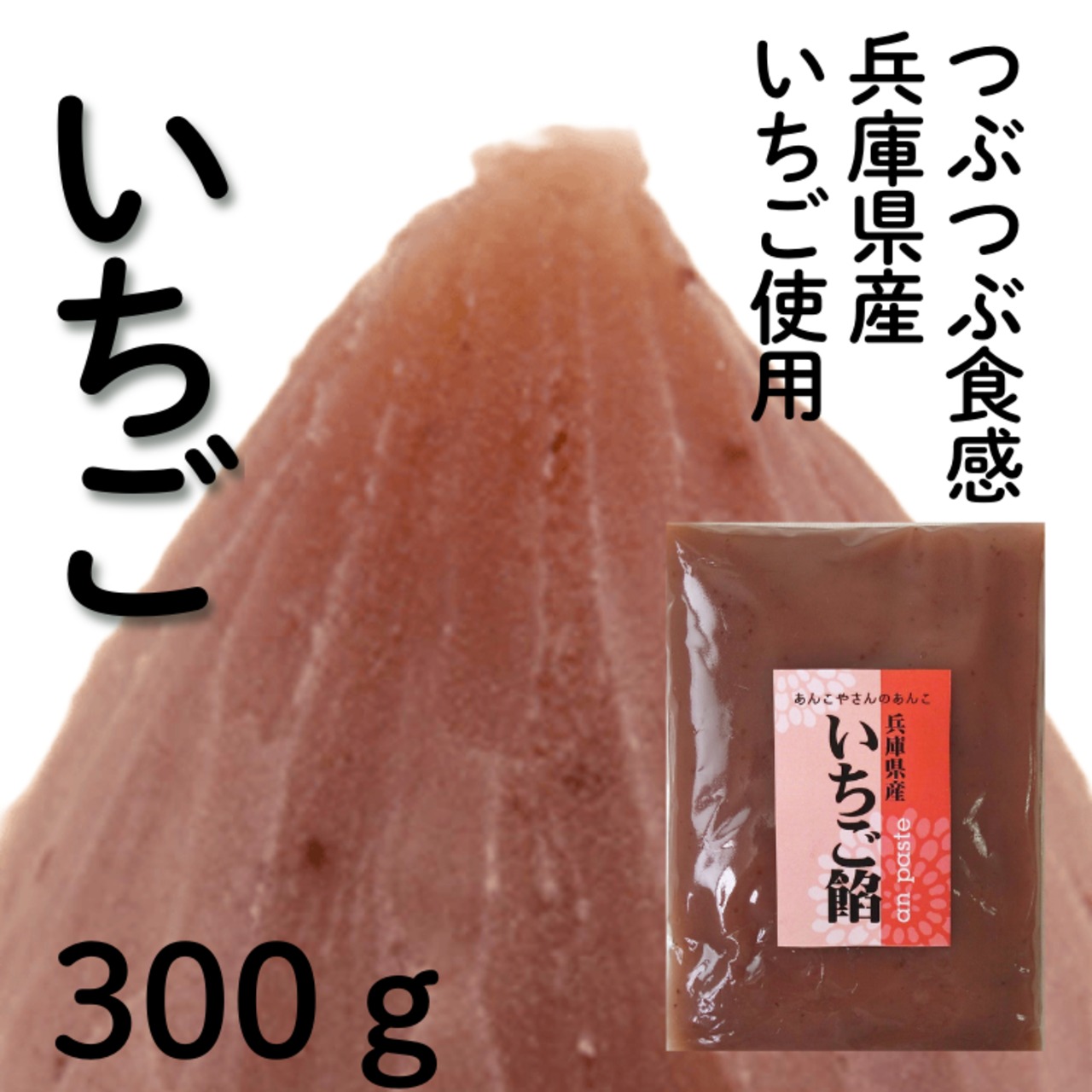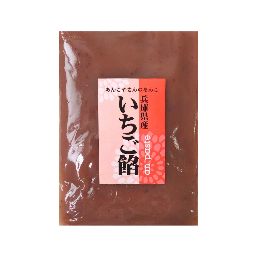 兵庫県産のいちごを100%使用したいちごあんです。程よい酸味と甘いイチゴの香りが特徴のあんこです。いちごを丸ごとピューレにしたものを使用しているので、種のぷちぷち感も楽しめます。そのままどら焼きに挟んだり、ホイップと混ぜていちごクリームとしてもお使いいただけます。